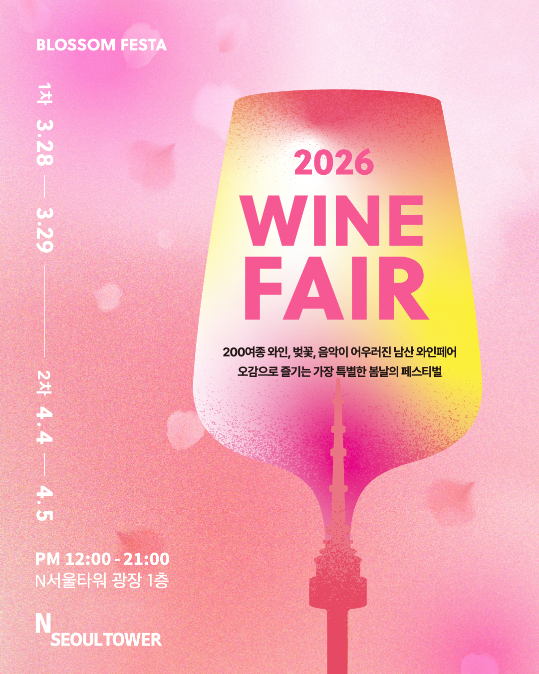 ![]() '오감으로 즐기는 가장 특별한 봄날의 페스티벌' 와인과 벚꽃, 음악이 함께 어우러진 남산 와인페어 200여종의 와인 시음과 라이브 공연, 와인 장터까지! 다채로운 콘텐츠가 가득한 남산 와인페어에서 가장 로맨틱한 봄을 만나 보세요! -일정 : 3.28(토)~3.29(일), 4.4(토)~4.5(일) -장소 : 서울타워 T1층 광장 -티켓구매 : N서울타워 홈페이지 참고 ※ 본 행사는 N서울타워 와인페어 티켓을 보유하신 분들에 한해 참석하실 수 있습니다. ※ 더 자세한 행사 리스트 및 가격 등의 내용은 현장에서 확인하실 수 있습니다. ※ 남산에 위치한 N서울타워는 남산 공원의 생태 환경 보호의 일환으로 2005년 5월 1일부터 일반 승용차량 통행이 제한되었습니다. 여러분의 협조가 맑고 푸른 남산을 만듭니다. |